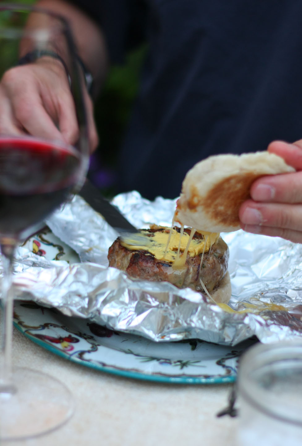 Hamburgers made this way - wrapped in foil after cooking, so that the cheese melts perfectly - have been a part of my life since my mother first made them. I think they evolved for my brothers' birthday parties, fuel for the Cowboys and Crooks.
